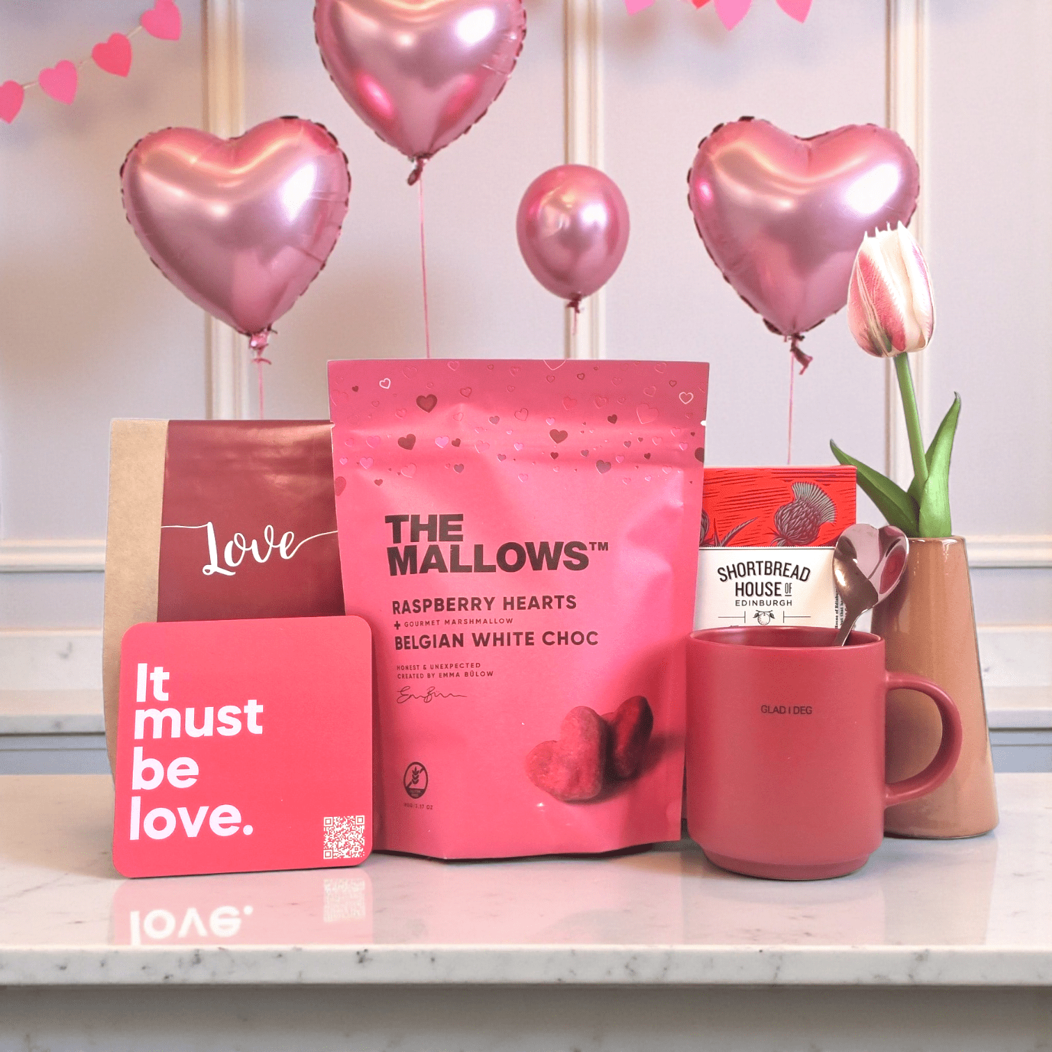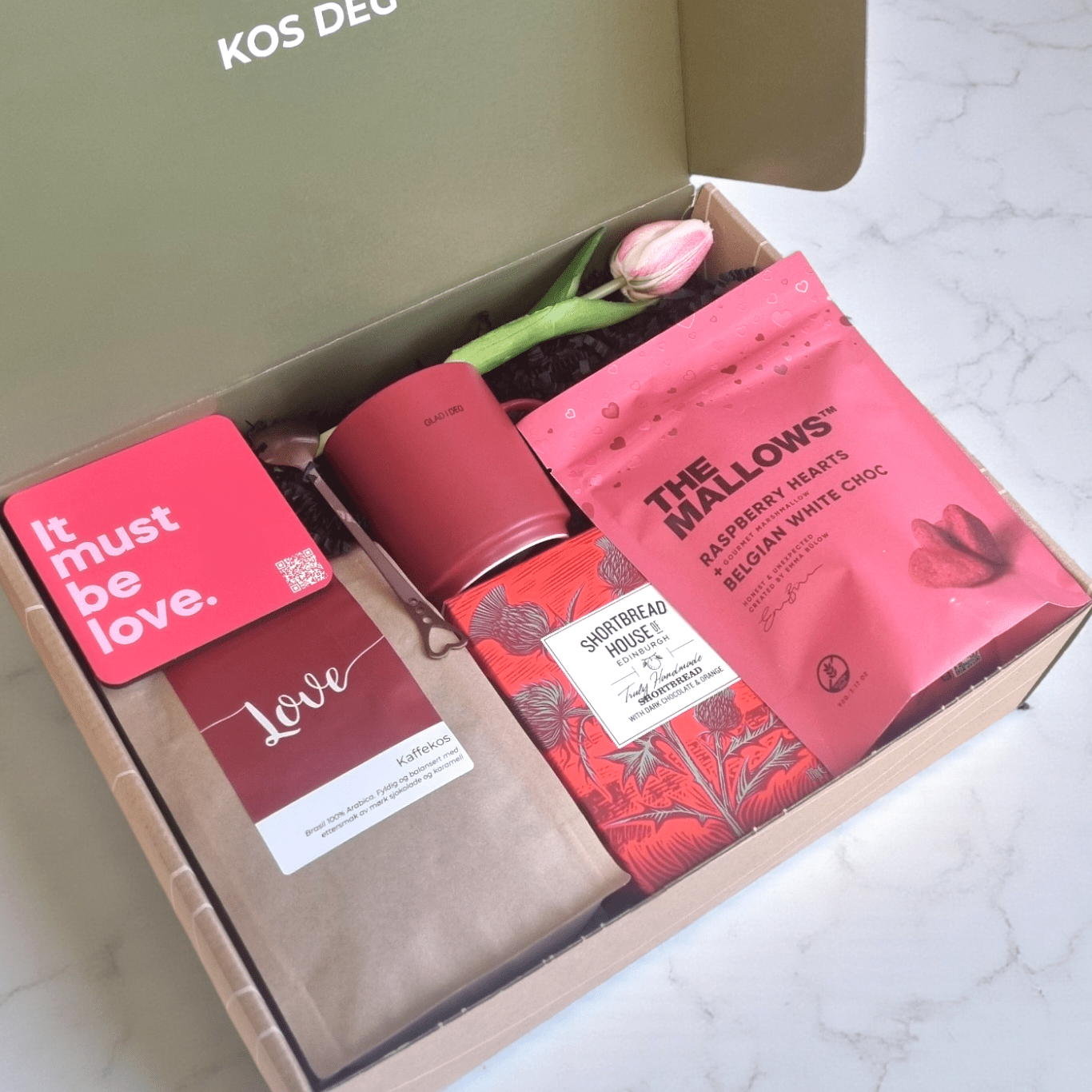 KOSI-LOVE 2 er den perfekte gaveboksen til Valentinsdagen – en koselig og gjennomtenkt måte å si «jeg er glad i deg» på. Gaveboksen er fylt med deilig smørkjeks, myke hjerteformede marshmallows og aromatiske kaffebønner, samt en koselig kopp med underlag og QR-kode til en spilleliste med romantisk låter