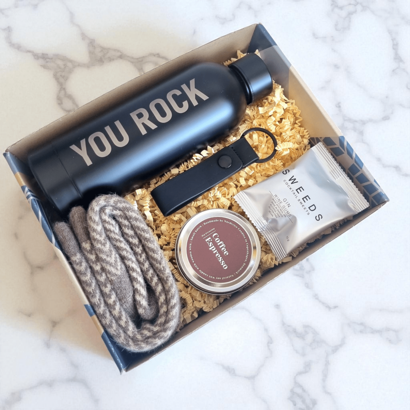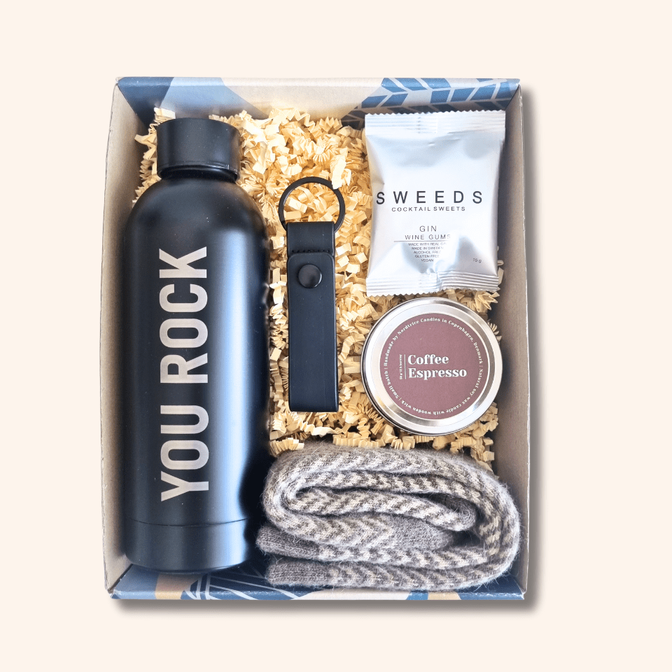 The package comes with a nice drinking bottle 'You rock' (500ml), a scented candle with an espresso scent, whiskey-flavored wine gum (alcohol-free), a key ring, and a pair of super soft wool socks*.
