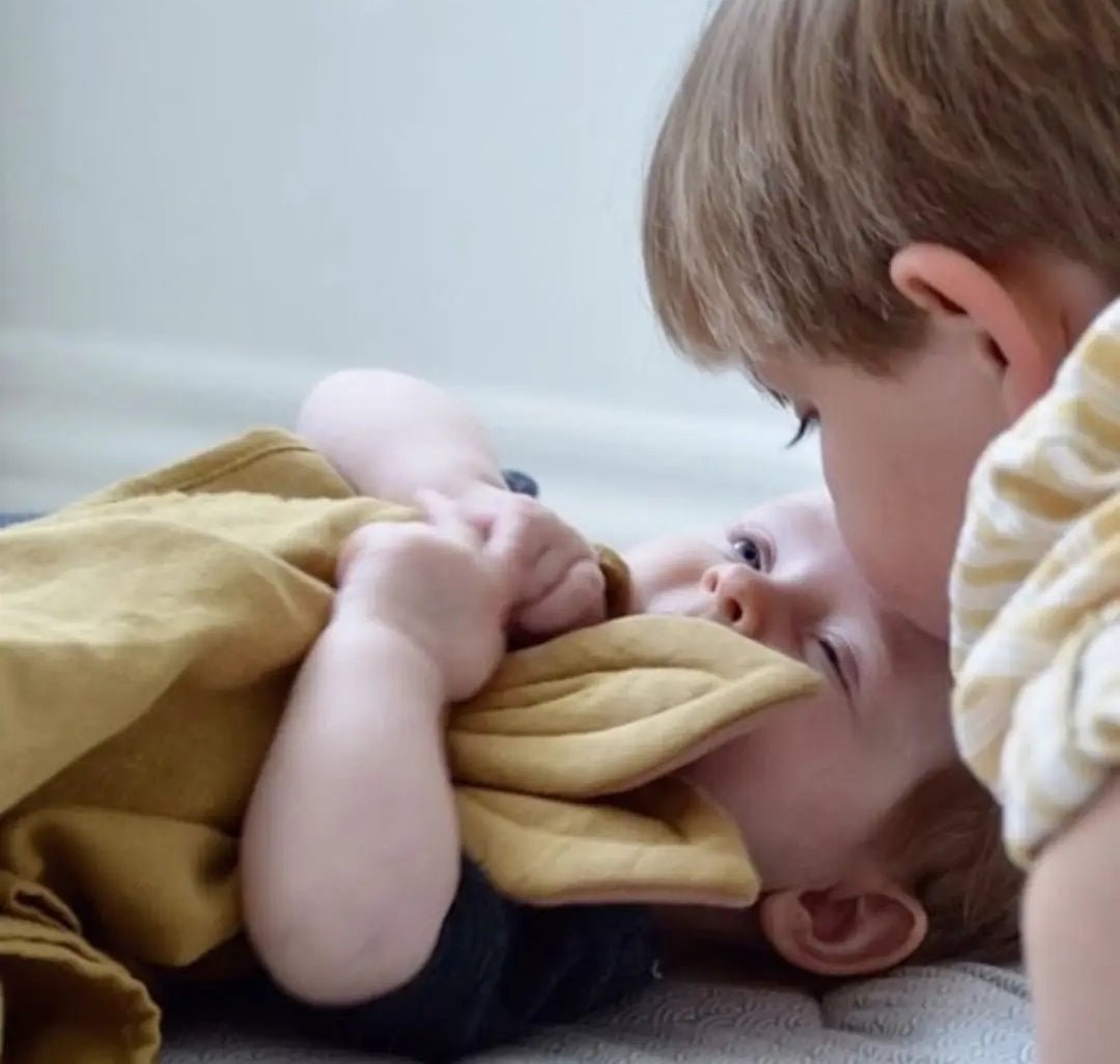 Et koseteppe som dekker mange behov! To lag med muslinstoff er sydd på, slik at du raskt kan tørke bort dugg eller søl. To myke ører på toppen kan babyen bite på, og med den medfølgende smokkelenken har du alltid smokken innen rekkevidde.