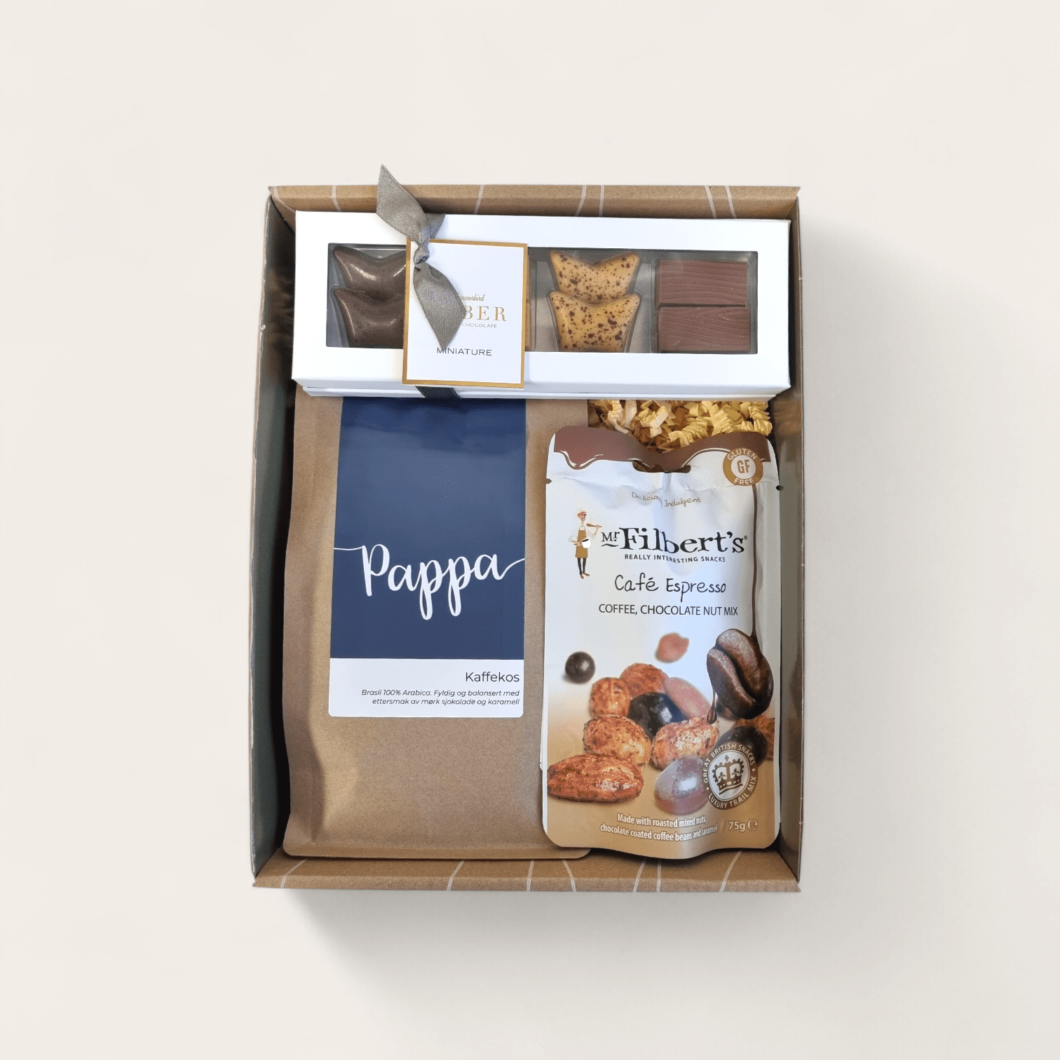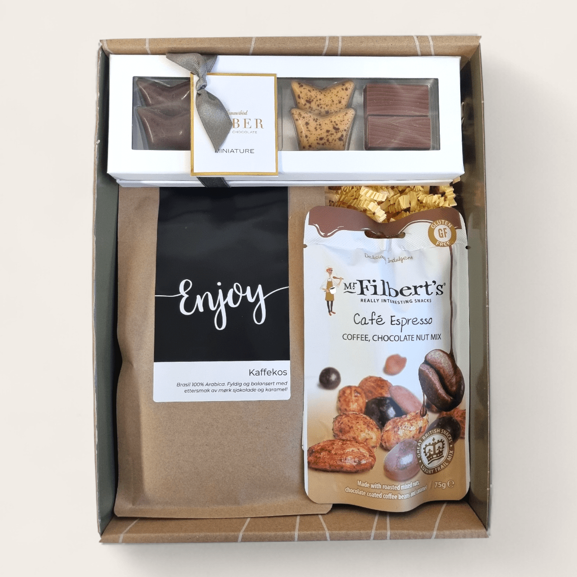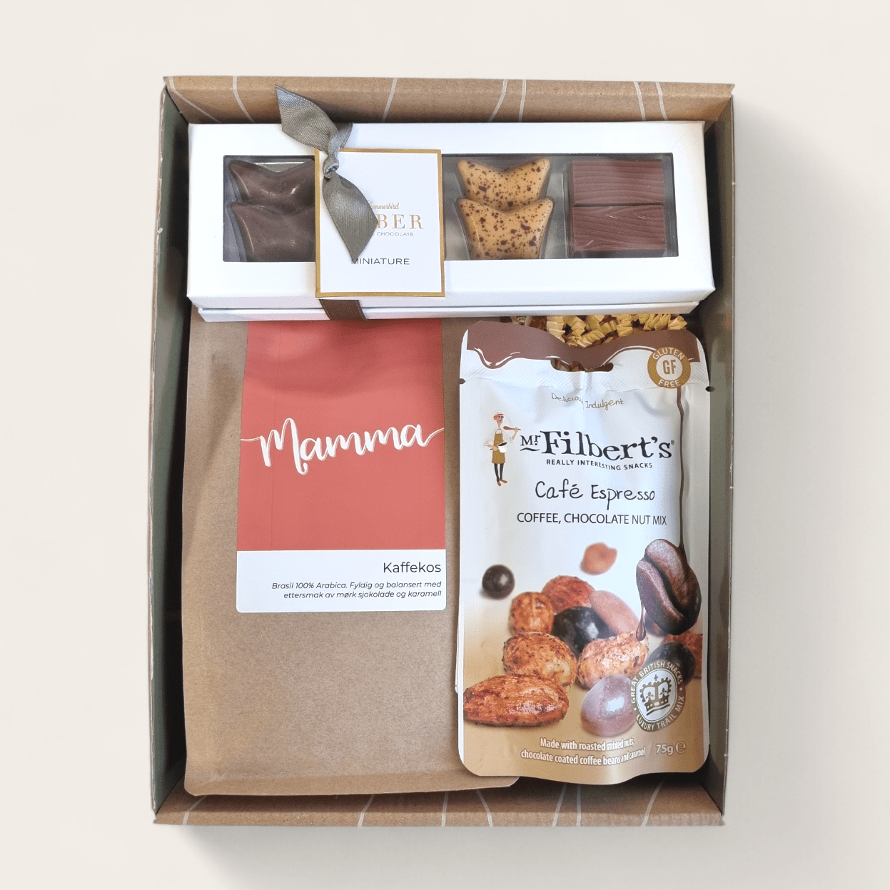 Denne pakken inneholder kaffe med 100% arabica kaffebønner fra brasil, nydelige praliner fra Summerbird organic og nøttemiks med smak av espresso