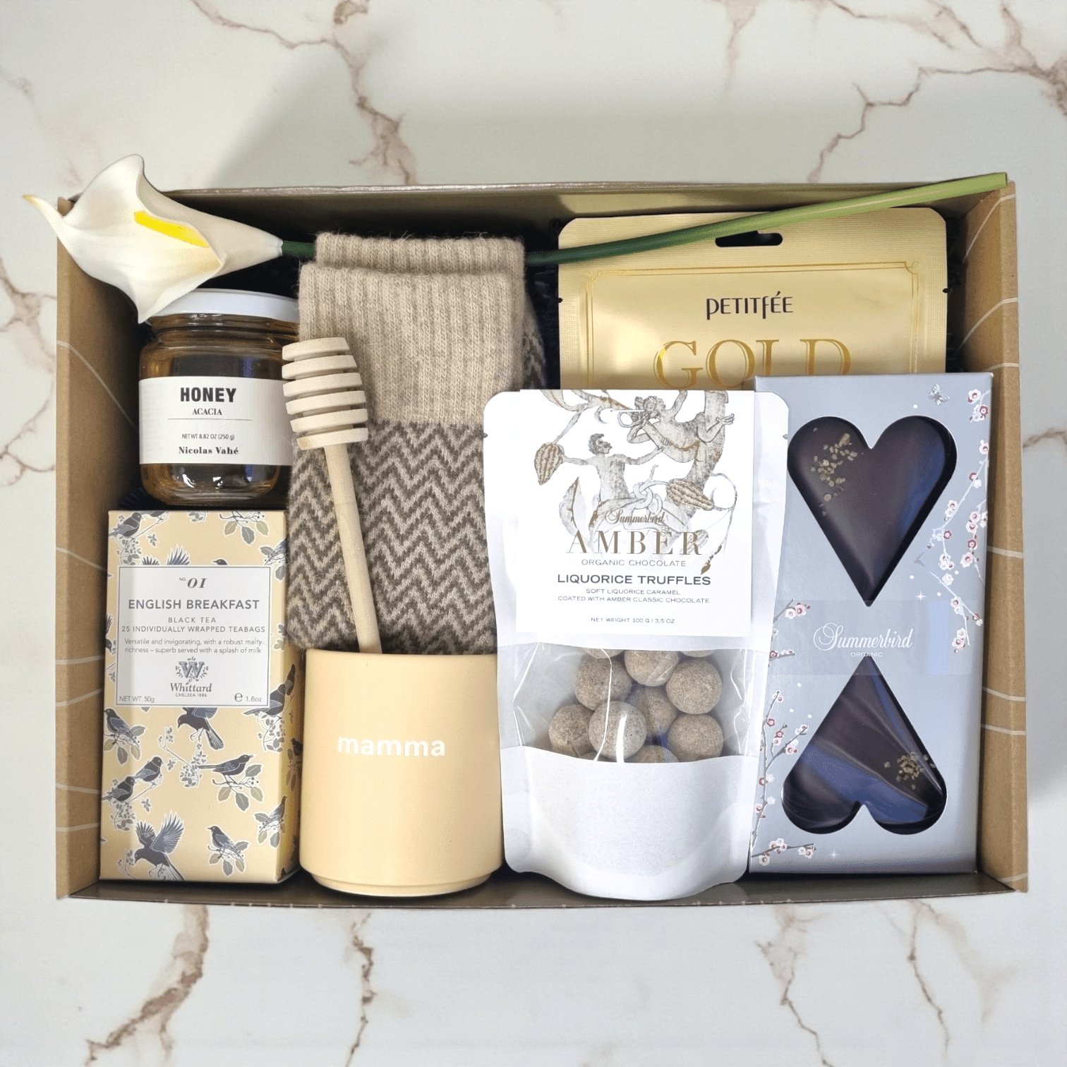 Boksen inneholder en stilfull mammakopp fra Design Letters, eksklusiv frokostte, honning med tilhørende skje, myke sokker i ullmiks, en pleiende hydrogel ansiktsmaske samt nydelige søtsaker fra Summerbird Organic som mamma garantert vil elske. En perfekt gave fylt med varme, velvære og små luksusøyeblikk - pakket inn i en elegant gaveeske, klar til å gi bort til denne verdifulle personen i ditt liv.