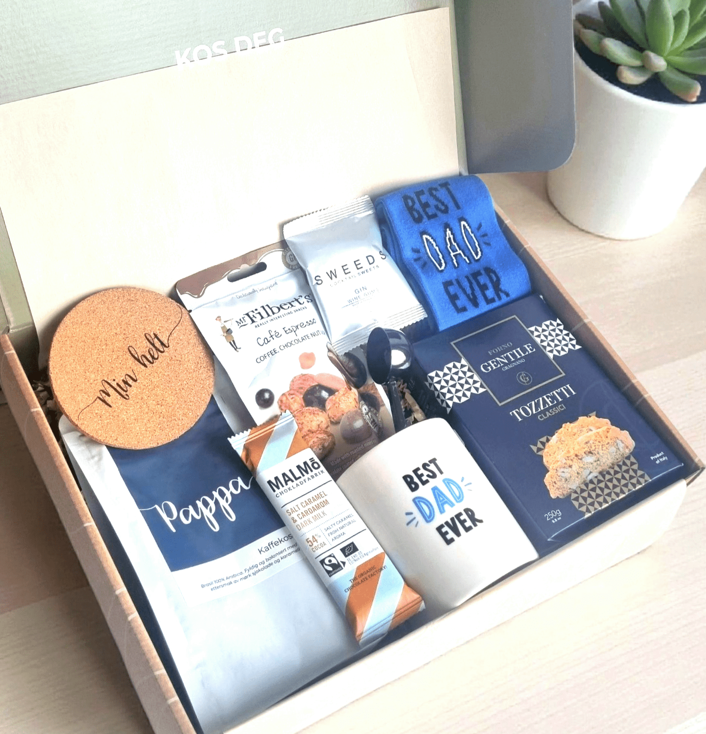 Pakken inneholder en koselig kopp* til pappa. Det følger også med flotte sokker, deilige kjekser, gourmet nøtteblanding, alkoholfri vingummi, og fine tilbehør for en ekstra koselig kaffekos med pappa!