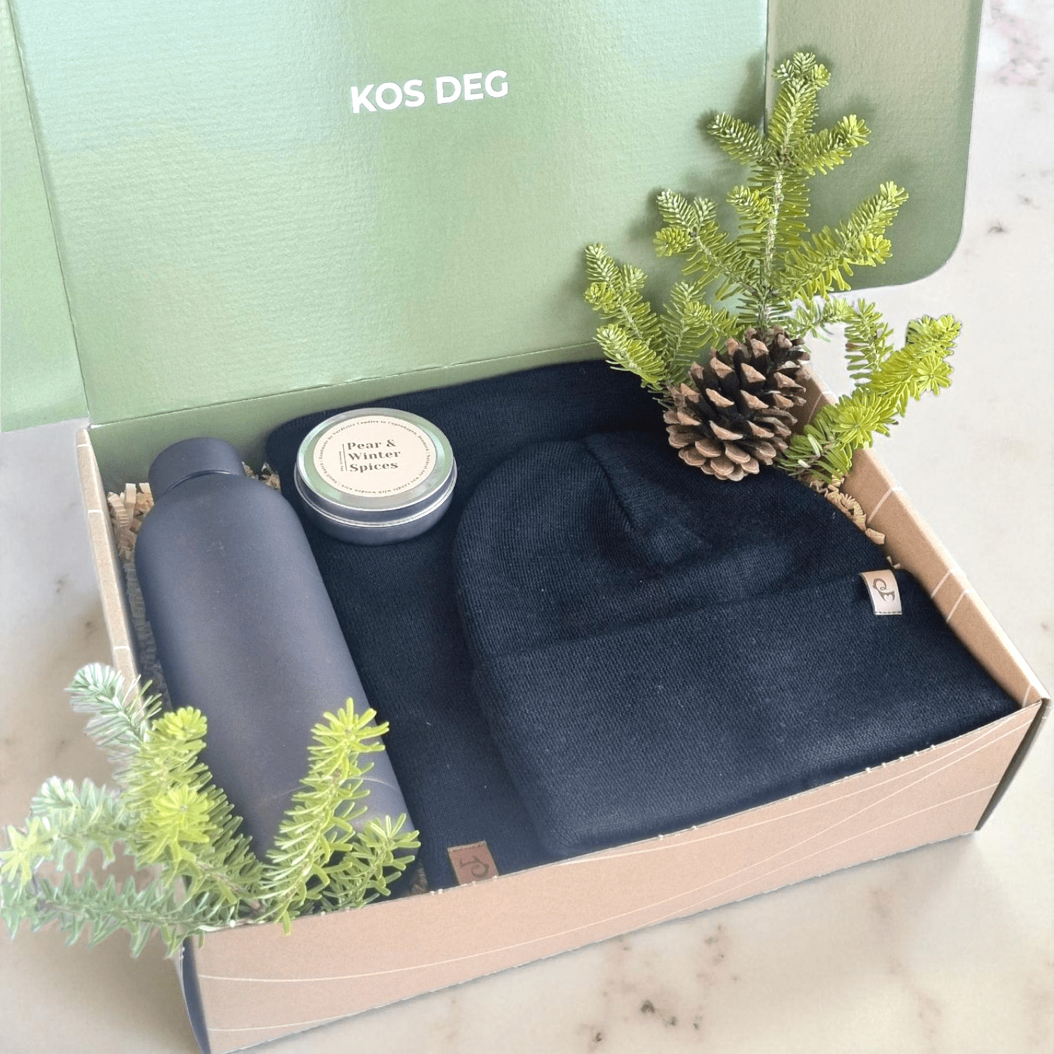 KOSI-WARMERS gaveeske er perfekt for å skape en lun og koselig stemning på kalde dager. Den inneholder myke og varme produkter laget av 100 % merinoull, et håndlaget duftlys med en krydret pæreduft som passer sesongen, samt en elegant termoflaske – ideell for å nyte varm kaffe eller te.