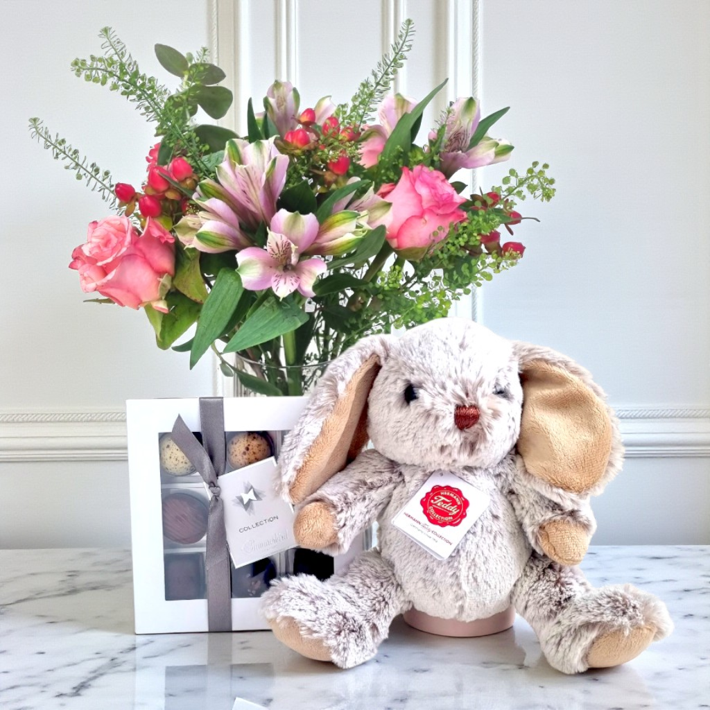 En bukett av sesongens vakreste blomster*, pakket i en elegant gaveeske ved siden av en ekstra myk kosekanin og deilige sjokolader
