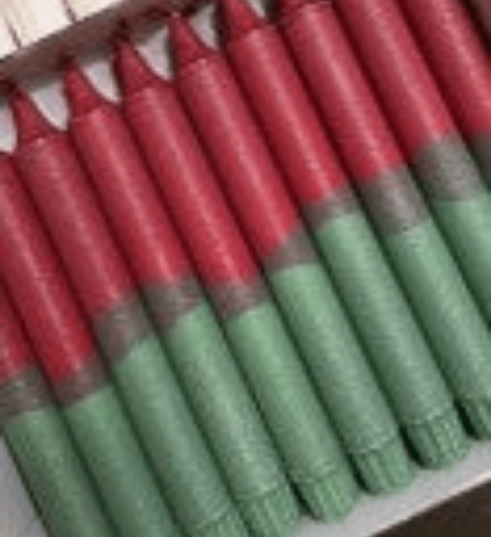 Hånddekorerte 20 cm høye bordlys i glittrene rød og grønn farger. Laget og designet med skandinavisk stil i København, Danmark av Nordtrice Candles.