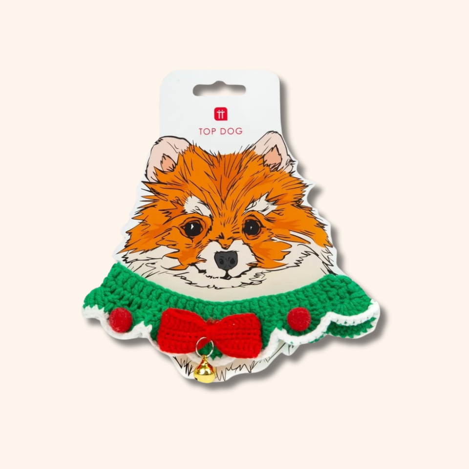 Heklet av rødt og grønt garn med julesløyfe og bjelle. Med dette halsbåndet er voffen klar for festlige feiringer denne vinteren.