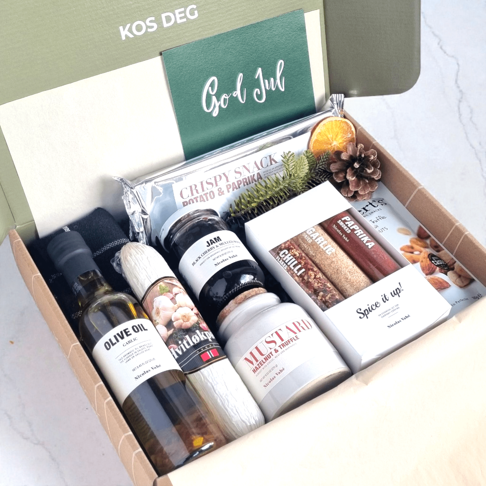 Gi en smakfull juleopplevelse med denne gavepakken fylt med håndplukkede gourmetprodukter av høy kvalitet. Her får du festlige smaker som virkelig setter stemningen og gjør gaven til en sikker vinner under juletreet. Perfekt for alle som setter pris på gode råvarer og små øyeblikk av luksus i førjulstiden.