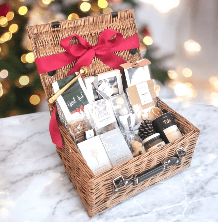 Paketet innehåller bl.a 100% arabica-kaffe, äppeljuice, panettone, skärbräda med motiv, vingummi, choklad och snacks – allt vackert inslaget i en handflätad korg med fina detaljer. En underbar presentupplevelse och julhälsning passande för en familj!