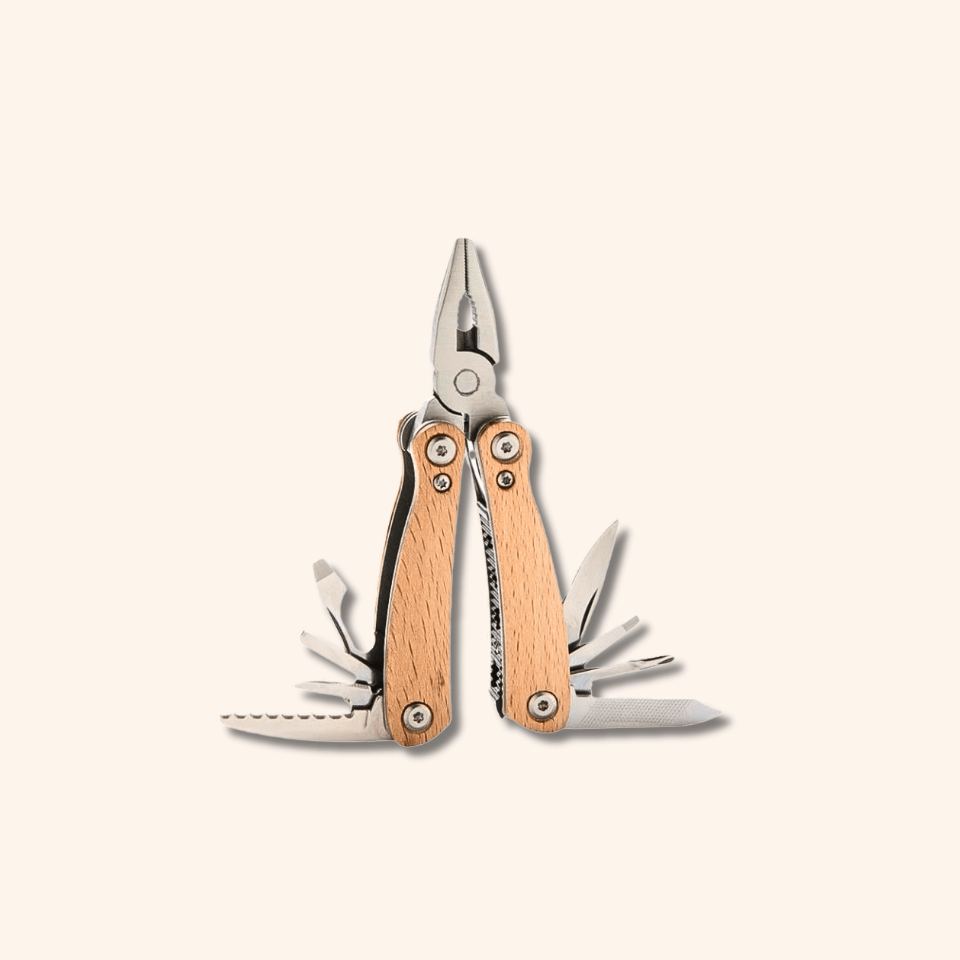 Miniverktyg med 10 funktioner, integrerad fjäder, trådögla för nycklar, tång, kniv, såg, flasköppnare, spårskruvmejsel (3 storlekar), stjärnskruvmejsel, trä- och metallfil, sidoskärare, spetsar (syl).