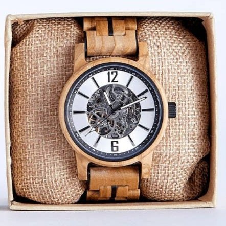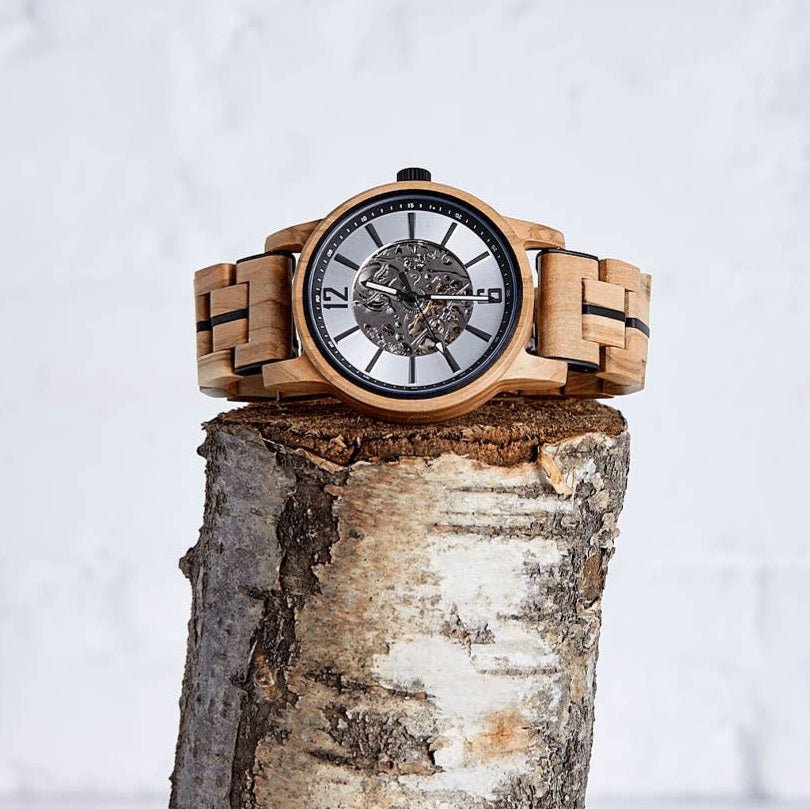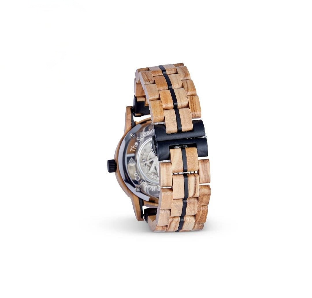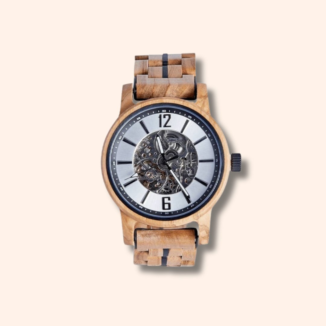 En ljus färgpalett framhäver de vackra nyanserna mellan olivträ och en ljusgrå urtavla. Den delvis exponerade klockmekanismen i urtavlan och på baksidan ger denna klocka ett raffinerat utseende.
