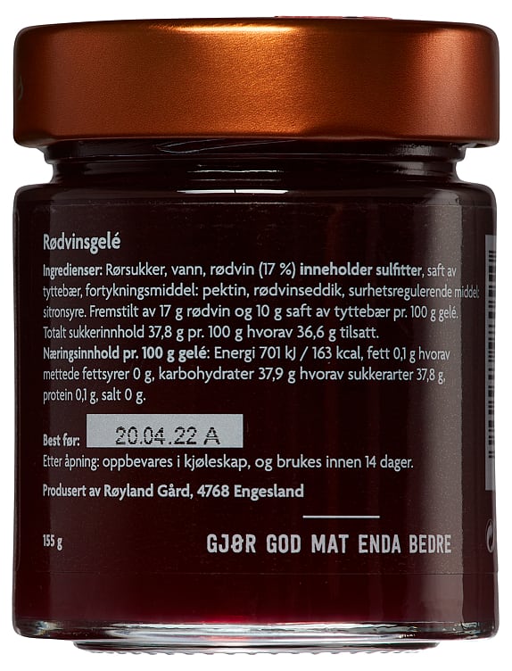 Røylands rødvinsgelé er en fruktig og rund gelé med nydelig smak av rødvin. Den er frisk og velbalansert med en behagelig ettersmak av frukt og bær.