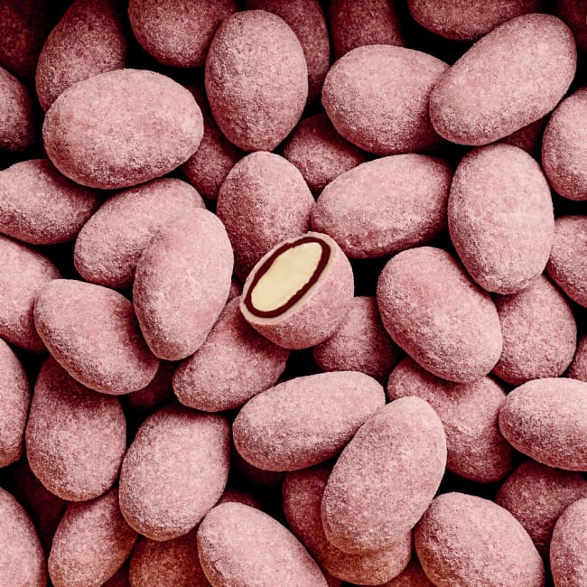 Lettrøstede spanske mandler drasjert med et tynt lag praliné, mynte og Guayas 71% mørk sjokolade vendt i fjærlett rabarbra-pulver.